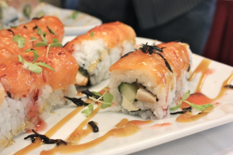A smoked slamon and turkey roll with Maple Teriyaki Cranberry Jus