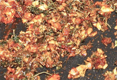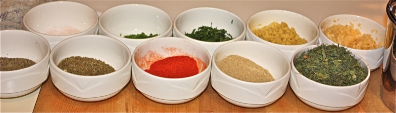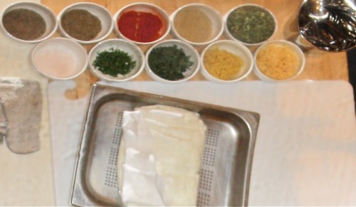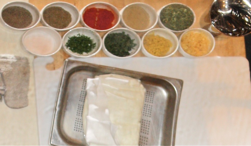 - Chick pea flour, marsala, salt, Spanish paprika (sweet), Fenugreek leaves (take the dried leaves in your hand and crush them)