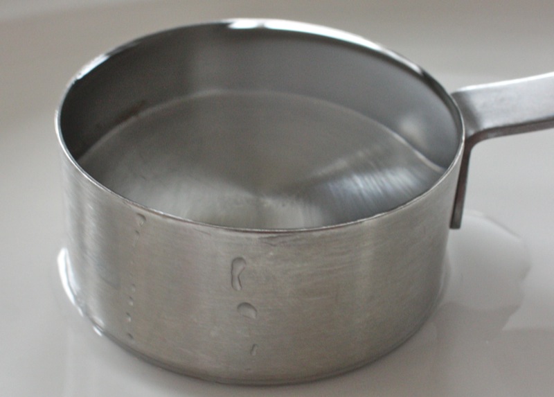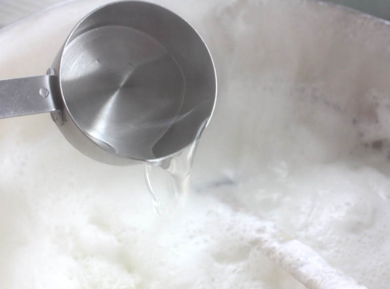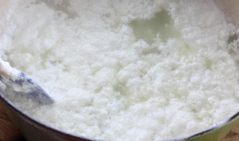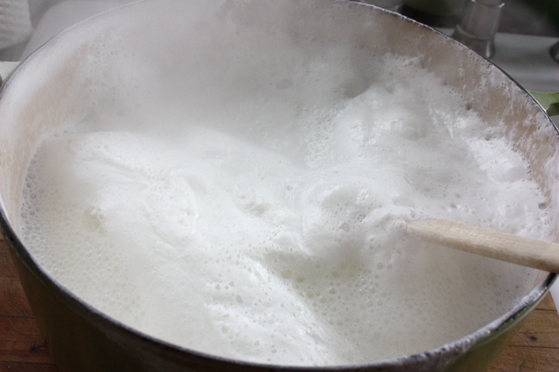 Have a sieve and some cheese cloth (I use a tea towel like I do when I make my yogurt cheese) ready. Measure 1/4 cup of vinegar, and then bring your two litres of milk to a boil. That is how easy this is. It took about ten minutes to bring the ice cold milk to a boil in my heavy pan.