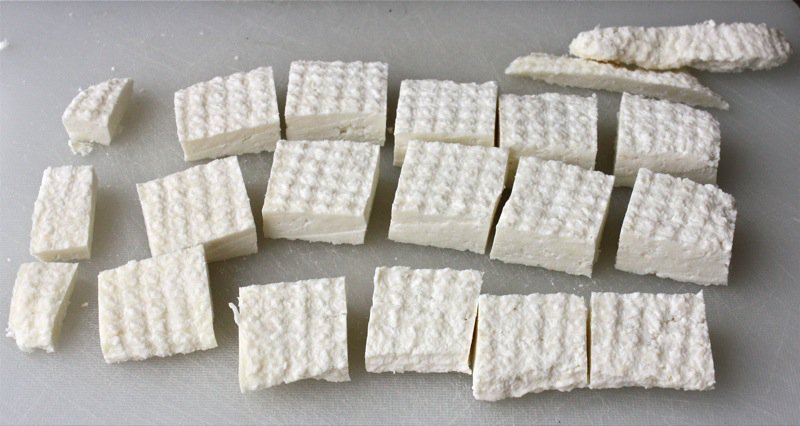 The sieve is from my Thermomix Machine – you could use a round flat tami… sold in kitchen stores. She has a stainless one probably also sold in Ethnic Indian stores. The 2 litres ended up making all of the pieces you see on the white board. That is it. about 1/4 of the amount of the milk. So, not so much, but, I suppose I would pay that same amount for fresh cheese. Try it! It is better than any paneer I have every eaten in a restaurant. But, you should know paneer before you make it, me thinks.
