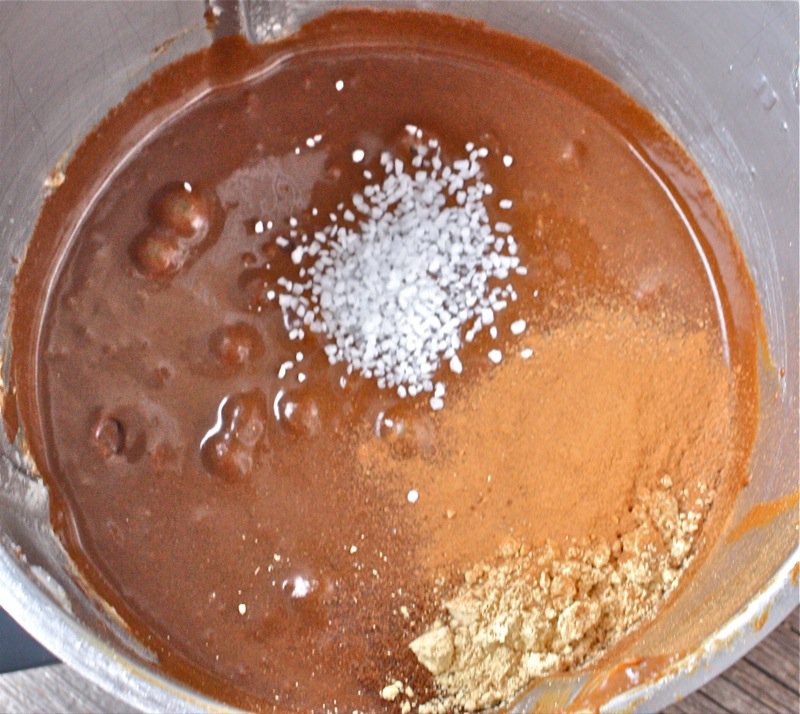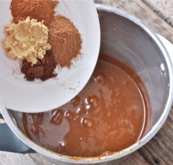 - Add milk, vinegar, spices, and salt to the molasses and egg mixture