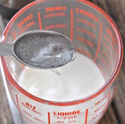 Add the baking soda to the sour milk; add the vinegar, next, and stir.