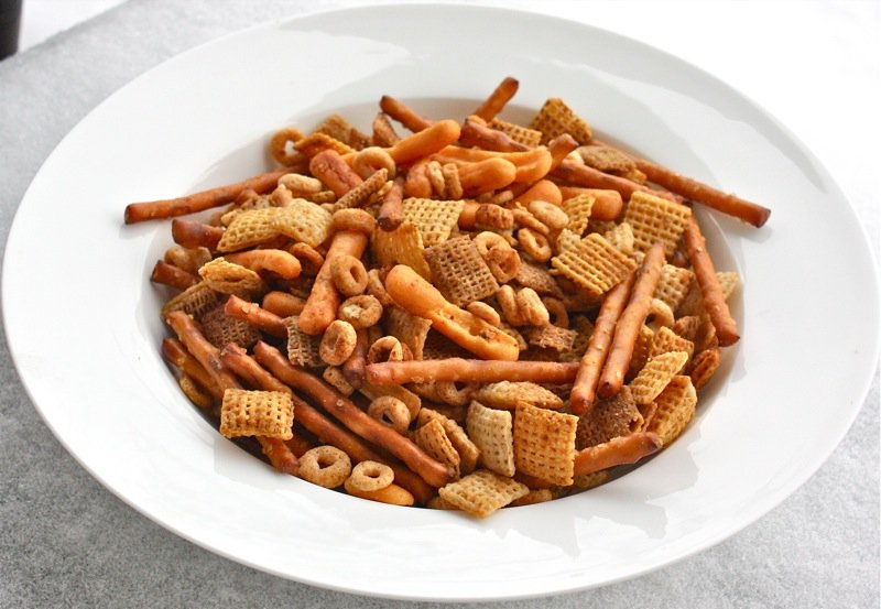 You can play with it a bit and use more of your favourite ingredients to make up the volume. For us it’s Cheerios, Chex, pretzels, corn chips, Pepperidge Farms Goldfish crackers and PC mini pita crackers. This year I found mini Triscuit crackers so I’ll toss those in as well. Peanuts aren’t popular in our family so I eliminated those years ago.