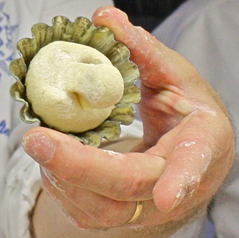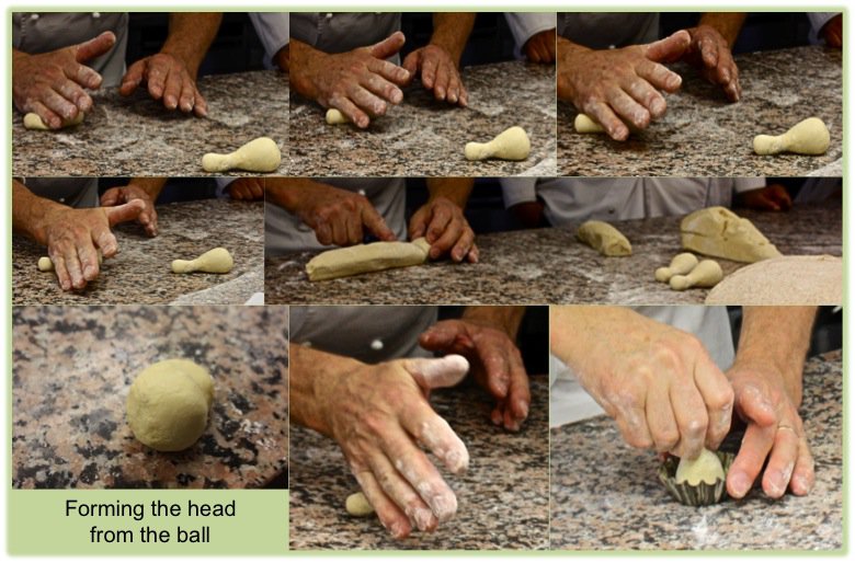 But, before we had at it, he showed us how to tuck in the head to get it to stand up straight. You can see above that he has plopped the dough into the form and then uses his forefinger to nestle the head into the ball, upright.