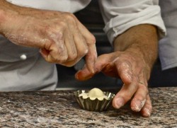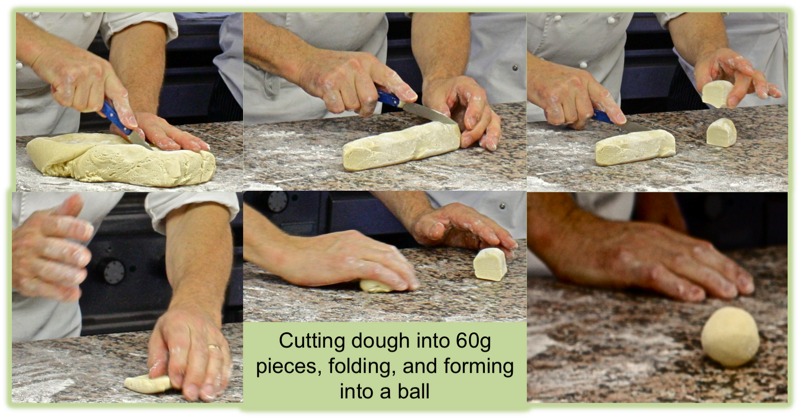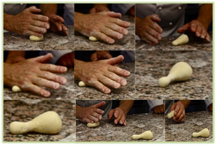 You can see how Chef Walters uses his baby finger to etch out about 1/4 to 1/3 of the dough ball. Then, continuing to use the side of his hand with gently and even pressure, he forms what looks like a bowling pin. He did it over and over exactly the same way.