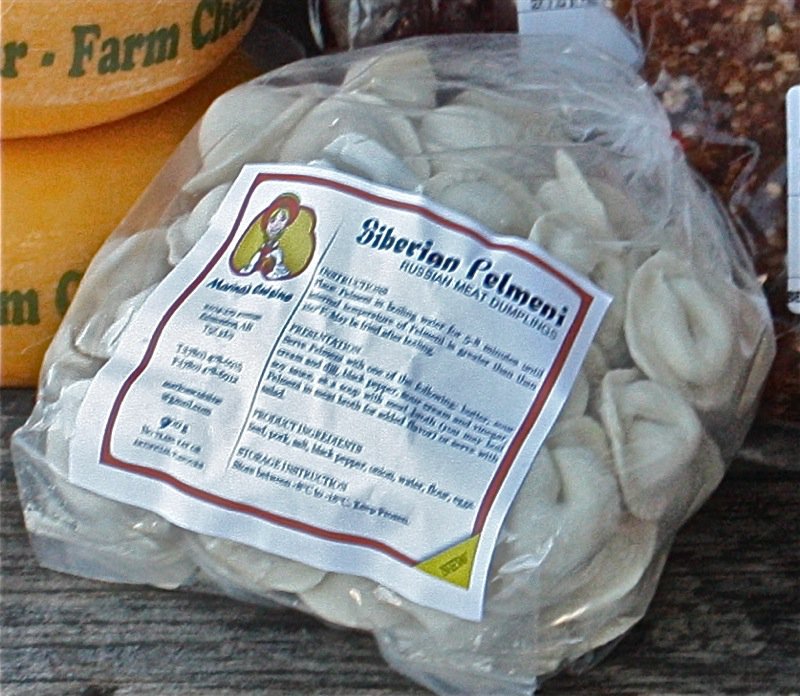 The last bag on the bench above is a treat, really, as I always make everything we eat from scratch. I tested one of these little Siberian Pelmeni and knew I had to learn how to make them myself. Until then, at twelve dollars a bag, I buy them as they are definitely a taste of Easter Europe and the meat filled bites are too yummy to pass up. Also, all ingredients are real food! I cannot read the name of the booth, but it is the Russian Booth that sells the sour cabbage and the wonderful multi-layered cakes. I tried to blow up the image to read her business name, but cannot. Maybe you can!