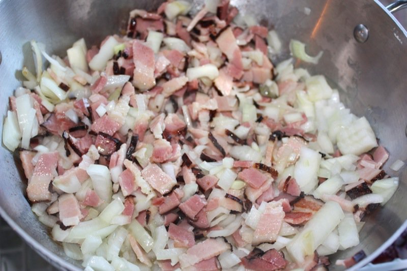 - In a large solid pot (the original French recipe says this is best done in a cast iron pot), sautéthe bacon and onion until both are translucent; add the cabbage
