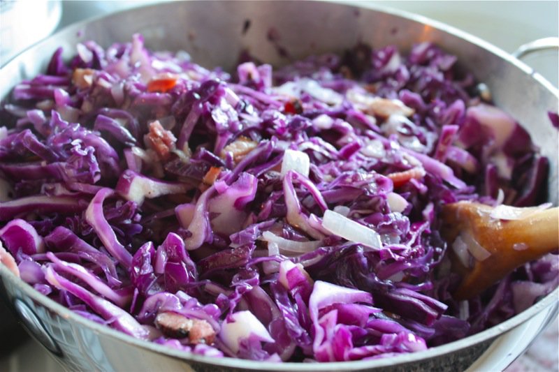 I can attest to the awesomeness of this dish – it was one of the most memorable bites of the evening for me, and many times since have I thought to ask for the recipe, as I love cooked cabbage, and intend on growing red cabbage this year.