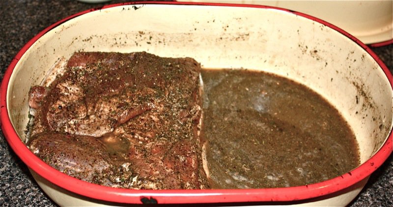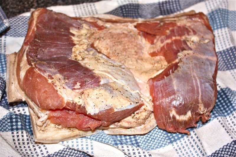 Below is a side photograph of the middle of a pork belly. You can see it has a considerable amount of meat… and fat! This is after it has been cured and I am removing it from the curing ingredients to prepare for cooking.