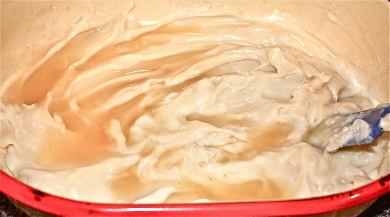 I was intimidated with how to serve it. I knew I wanted a piece of meat or two on top of each dish, but I didn’t know how to “carve” the meat. Fortunately, Kevin was able to assist! You may think that is funny, but when I saw the pork belly cooked, I really didn’t want to “mess it up” by fishing into the meat and maybe breaking up the pieces. My experience with duck confit is that if it is over cooked, it just falls apart. This doesn’t happen with pork belly confit. With a couple of forks, you just push the fat away from the meat and the warm meat easily releases from the fat. As I had sectioned the belly, it was easy to continue through that slice with the fork and get fairly even chunks of meat.