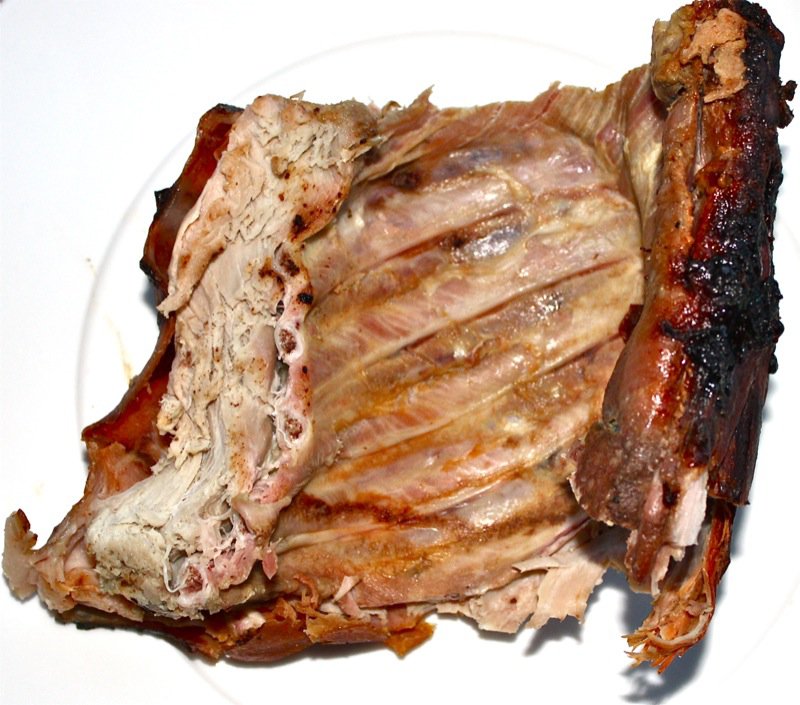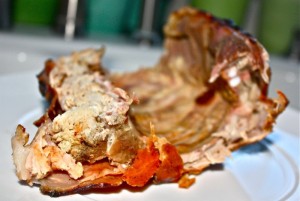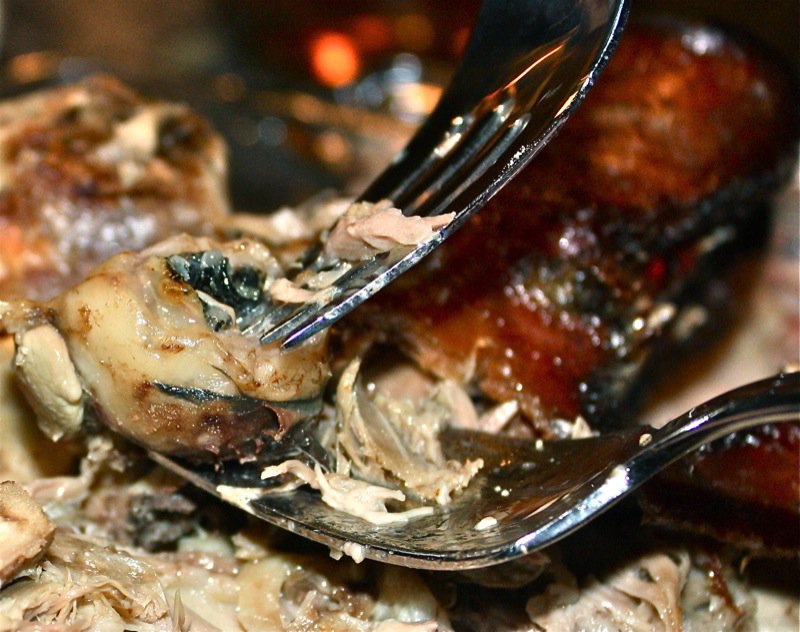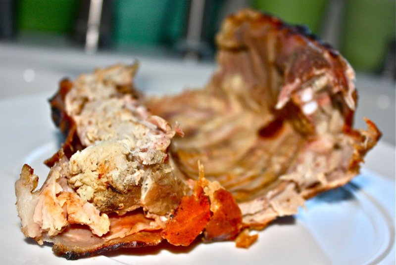 The skin on this little baby was definitely crispy and yummy! Look at Corey’s perfect dissection of the cheek, below. He had apparently been dreaming about it for days and was polite enough to leave the second one for another cheek lover.