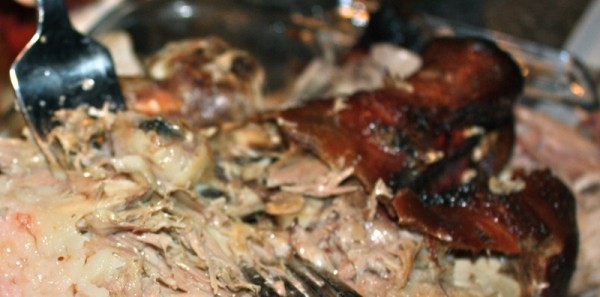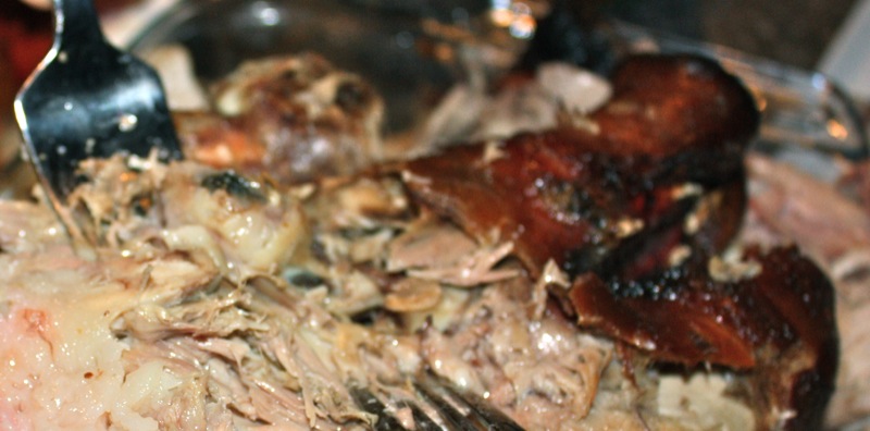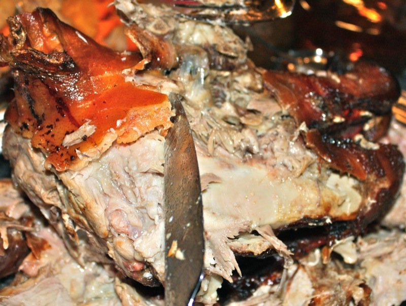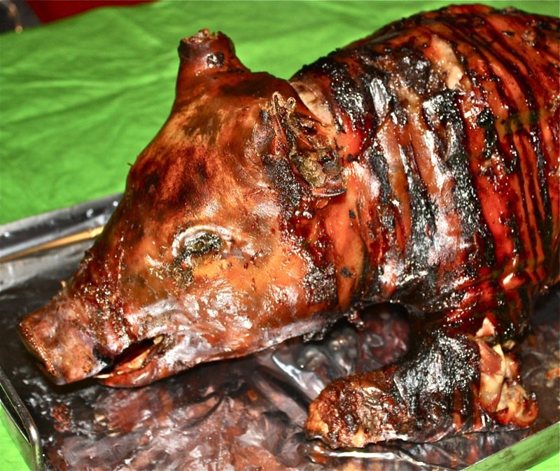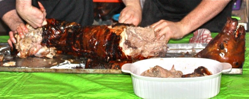 The pig arrived just before 7 am as planned. There is something novel and primal all at once seeing a whole beast roasted in it’s entirely. I get a little thrill of curiosity and excitement. I don’t even eat meat. But, I do taste it! The ears and the tail of a roasted pig are coveted, and this one came with them broken off!