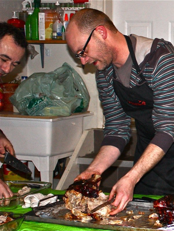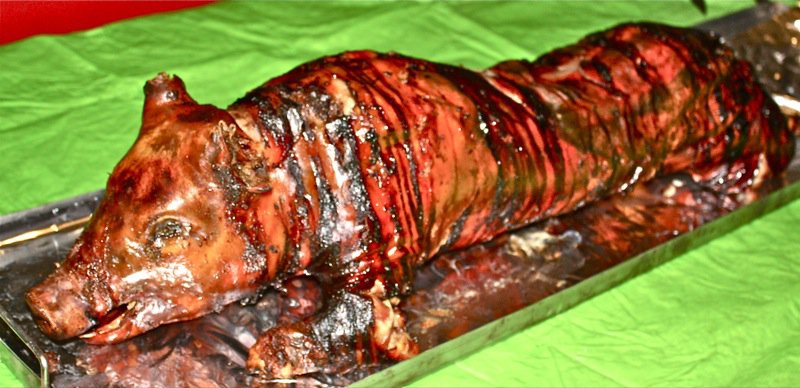 The fellow that roasts these (and has for years) for people from his home country during celebration season, was dumbfounded that little Berkie, below, was completely done in two hours. He is a little darker than last year’s pig! Very little fat under the skin, too… it was woven throughout the meat. This was the most moist, succulent roast pig I have ever tasted! The colouring here is not distorted. He did have a “surreal” glow!