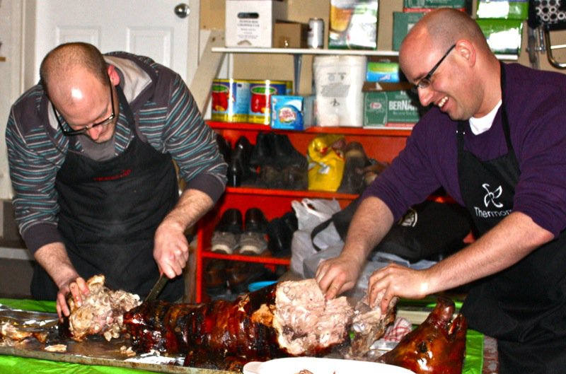A great job of summarizing the evening. I realized after I was on the road that I left no contribution toward the pig. I can send a cheque or offer you $20 of meats from our booth at the market. Your choice. Great event, super photos!