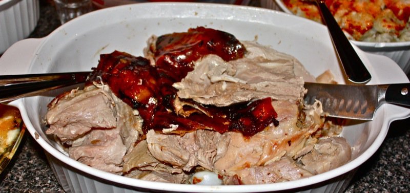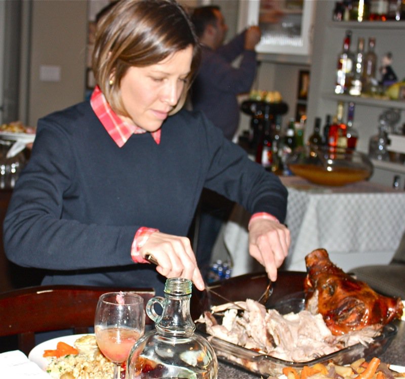 So much food from so few people. We had a feast in the middle of this incredible blizzard! Deanne is selecting some of the succulent piggy!