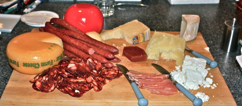 Below is a collection of Sylvan Star specialty cheeses for Christmas (the yellow mini Gouda and the red mini Edam) with their delicious Feta. Holly’s special Tome (not for sale but to enjoy at this potluck) made iwith unpasteurized milk was particularly special. They all were, actually: Piavê Vecchio and (Kevin will remind me) from the Italian Center Shop with Jerry Kitt’s yummy Bison Pepperoni (from his farm: First Nature Farms). The salami is an Iberico chirozo specialty that is incredibly delicious and Jerry informed us that Slow Food International was instrumental in saving the Spanish Iberico pig. The shunka is a traditional smoked prosciutto type meat from Vanja’s country bought at the Budapest Deli.
