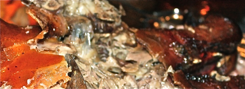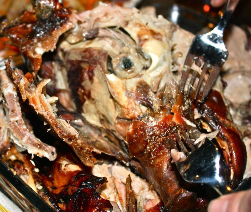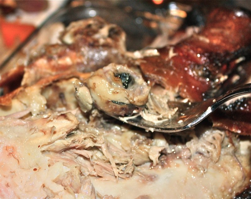 Then, Kevin got his fork in the head and started to extract the eyeball. Apparently that is a very delectable part of the head. Below, he has lifted the skin over the eye, and the cartilage, or the shiny fibres, are evident as he pulled the skin up from the side of the face.