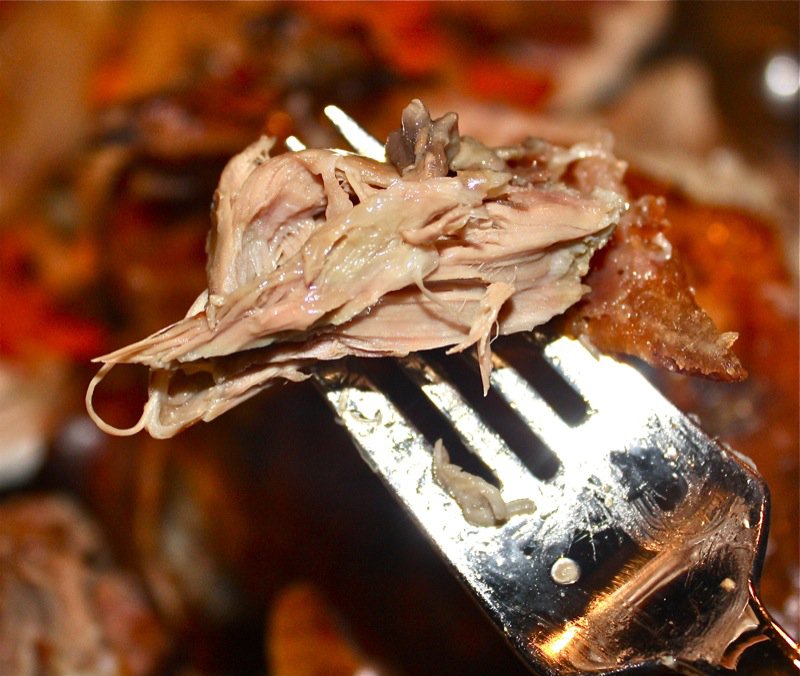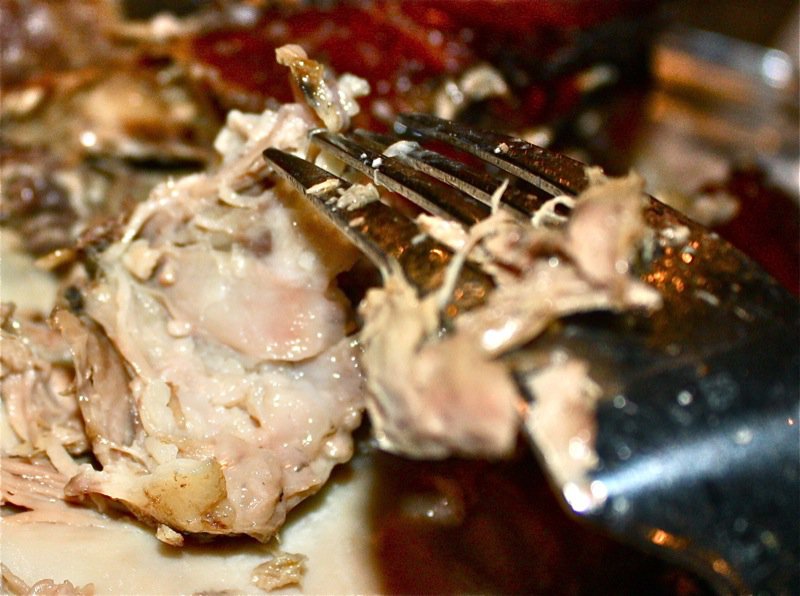 Below, is a piece of the meat from the temple. That was also delicious. But, look at it. It looks like meat. It is meat. It is just that it is meat from the head that some find off-putting. More and more are recognizing the importance of valuing and using every part of the animal. If you read Kevin Kossowan’s blog, you will see that he has weighed the meat on the average adult pig head and it is considerable. So considerable, he eats all of them now.