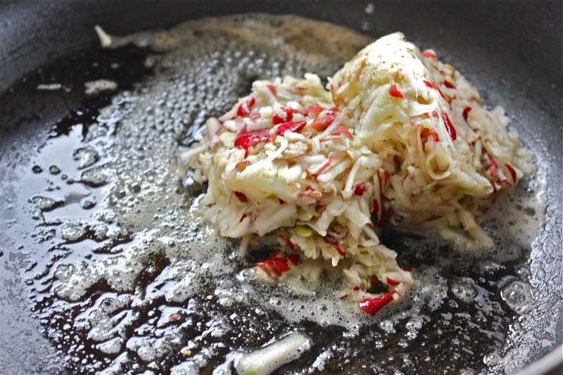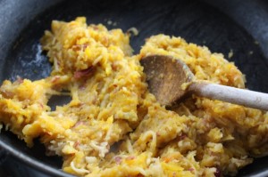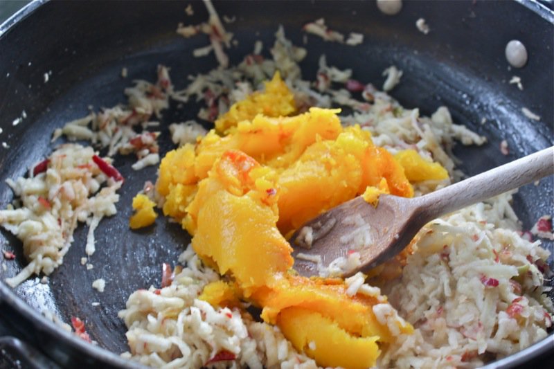 - Discard the vanilla bean; add the squash and the ginger to the apple mixture, fry a little longer until mixture is drier and well blended (about 1-2 minutes); set aside