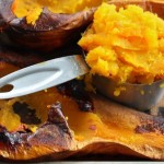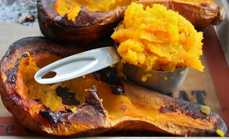 - Cut a butternut squash in half, remove seeds, and roast, face down in oven, on parchment covered cookie sheet for one hour; cool and scoop out flesh measuring one cup for this recipe and puree; reserve the remainder for other use