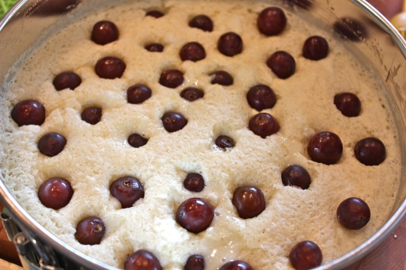 I followed the instructions to a “T” with the first cake and their was a little too much of a crust formed at the time suggested to add the second half of the grapes to the top. Watch your oven and the surface tension of the cake carefully and add them when they will just sink into the cake. This still worked well, as you will see. I also did not use the weight of the grapes in the recipe. Mine may have been smaller.