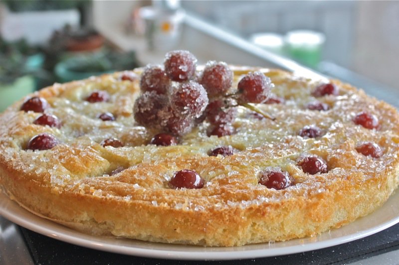 This is such a beautiful cake. I like how the sugar crystals coating the grapes resemble frost on fruit, a beautiful symbol for the weather outside.