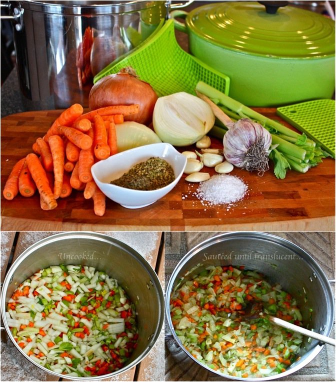 We cheered one another on to completion… then, mise en place, good to go to the stove… and the magic started to happen. The aroma. The sizzle. The glistening of the fragrant vegetables transformed through this specific combination: onions, carrots, and celery (2:1:1) “The Holy Trinity“