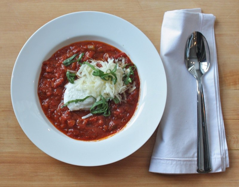 It smelled so good, I had to eat some. I never eat a bowl of tomato sauce, but a bowl of Pizza Soup with my homemade yogurt embraced by the thick warmth of the Holy Trinity topped with shredded cheese and garnished with a fresh basil chiffonade? Now, that is an entirely different matter. MMMM MMMM good! (NOT Campbell’s Good: Homemade Good!)