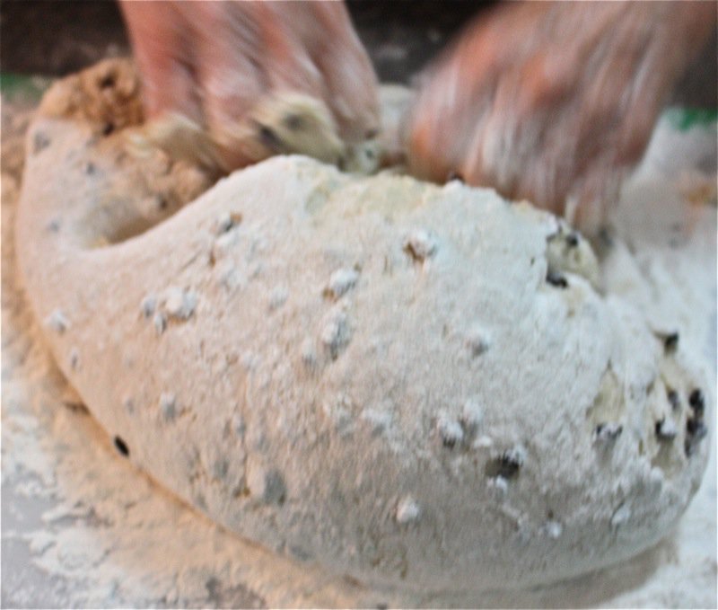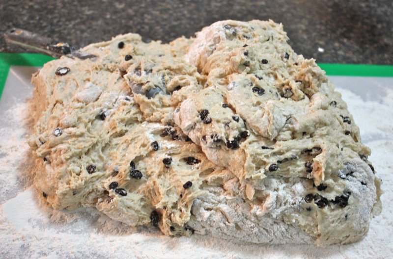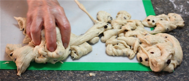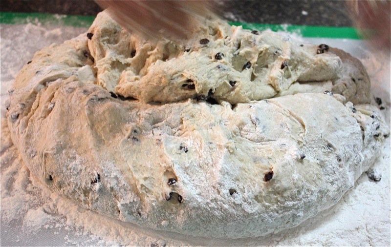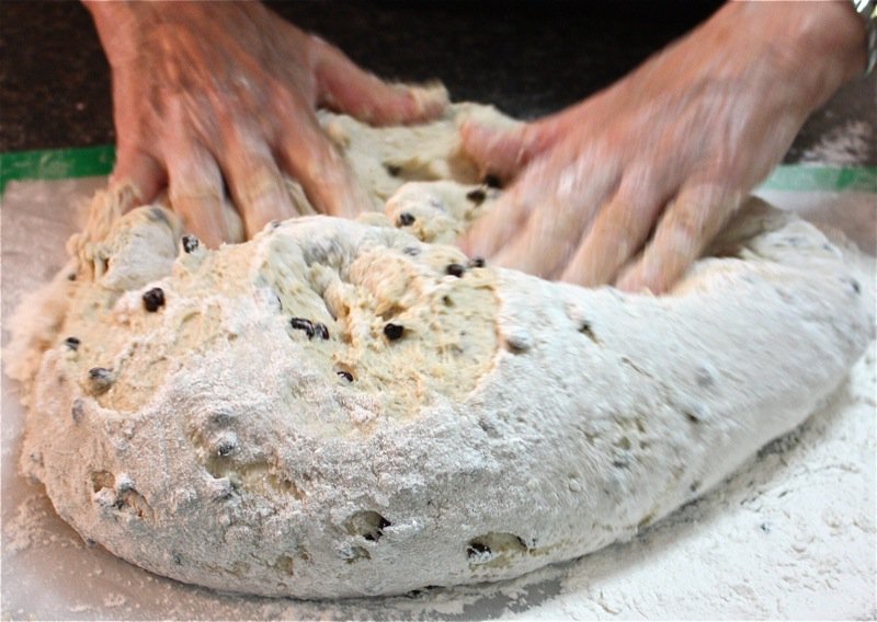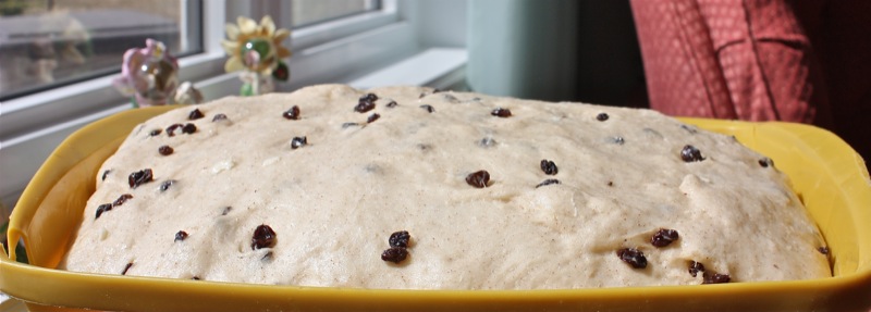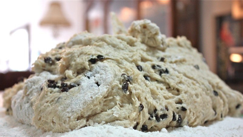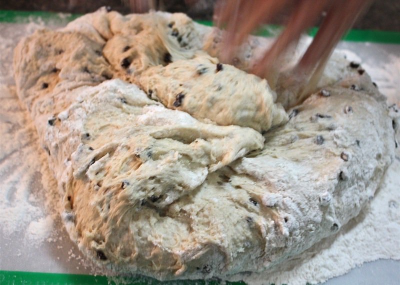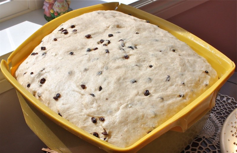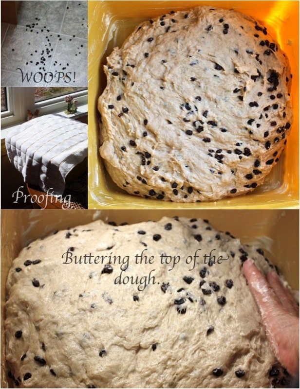 It wasn’t long before I had to get my hands in the pillows of yeasty goodness. I worked the dough the French way, and it was a pleasure to work with. It is a wetter dough, similar to brioche to the touch as it is full of eggs and butter. You can see, below, that I lost a few currants to the floor as I was incorporating air into the dough! Back into the bin it went, covered with butter, and into the sun in the window for a warm rest to proof.