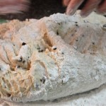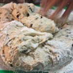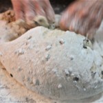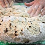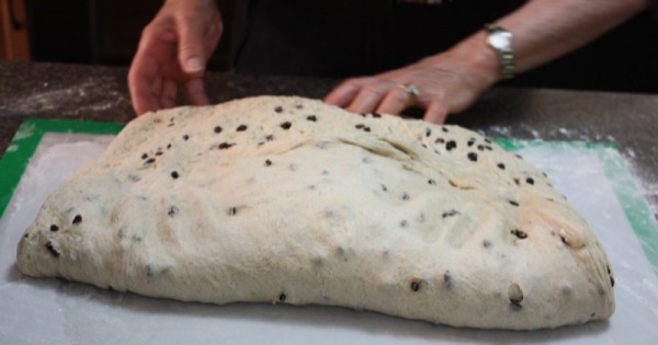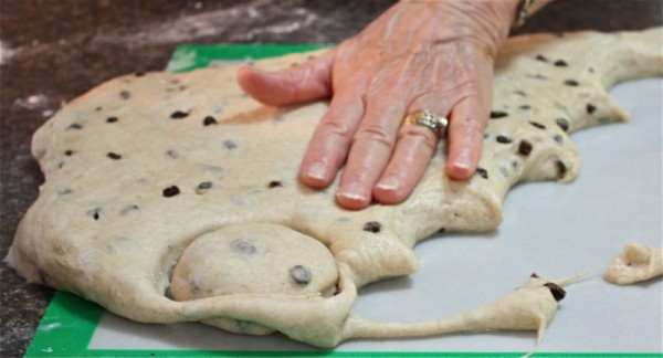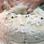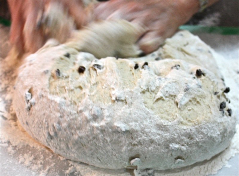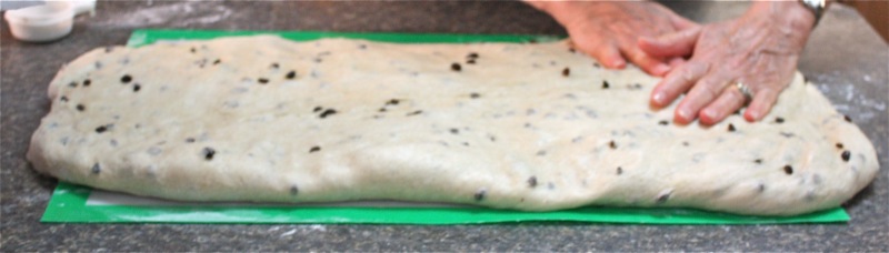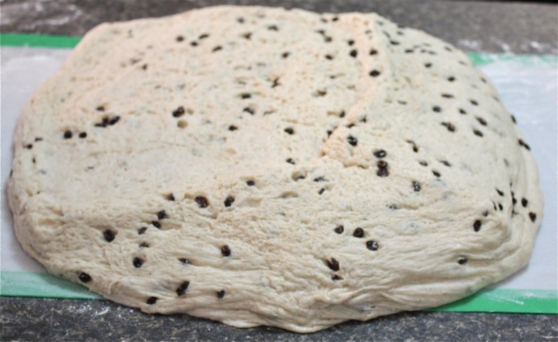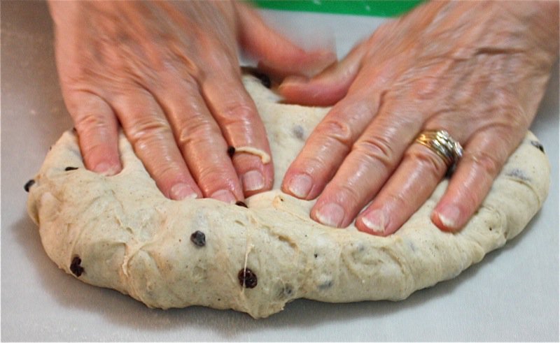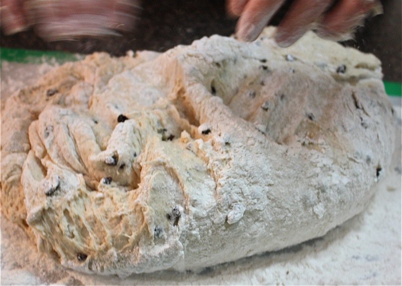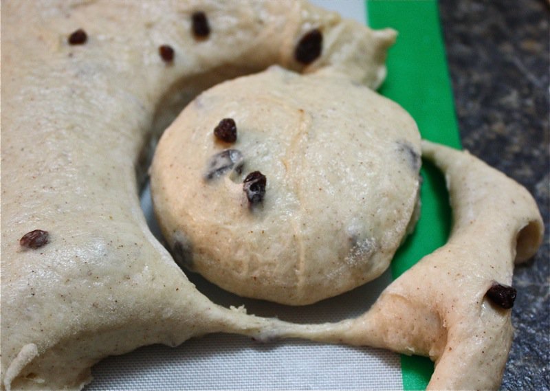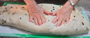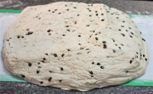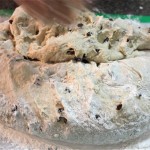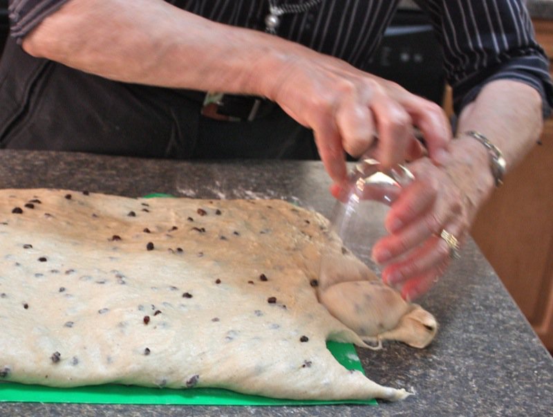 It wasn’t long before I had to get my hands in the pillows of yeasty goodness. I worked the dough the French way, and it was a pleasure to work with. It is a wetter dough, similar to brioche to the touch as it is full of eggs and butter. You can see, below, that I lost a few currants to the floor as I was incorporating air into the dough! Back into the bin it went, covered with butter, and into the sun in the window for a warm rest to proof.