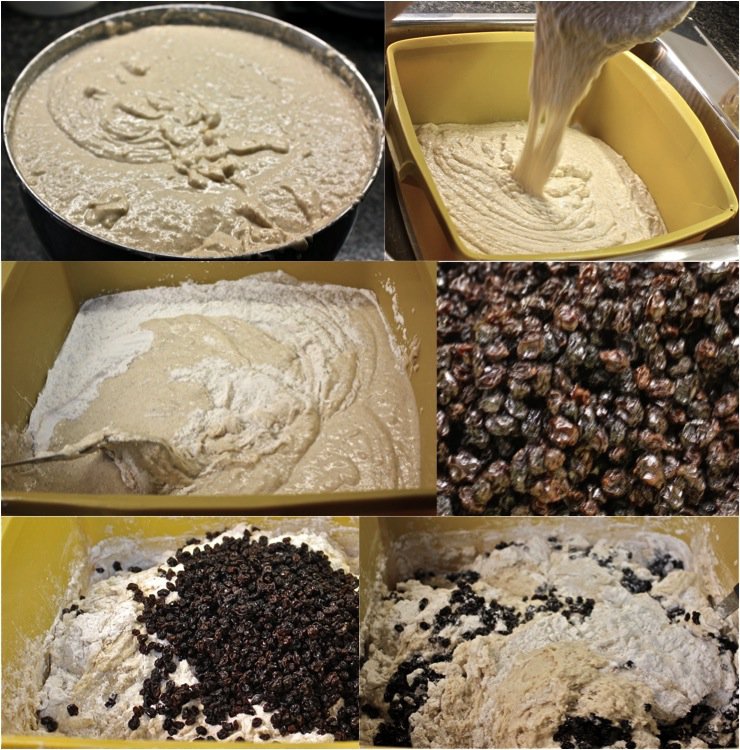 Now, the bowl has incorporated everything but the next portion of flour (6 cups) and the currants. This is added to the bin with the dough.