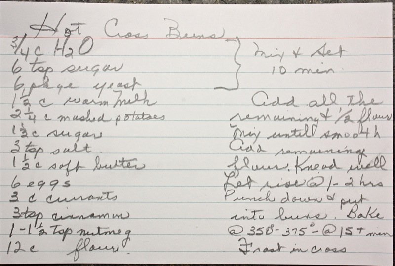 When I did first see them in the stores, I was, frankly, shocked: blasphemy in the bakery! The buns were square and lifeless and squished and the beautiful glistening cross was fake! It was made with some kind of white doughy stuff and baked with the bun. This was the consummate disappointment. I would never buy a hot crossed bun or eat one that was made commercially. This would be like comparing gooey processed white-bleached Wonder bread to beautiful artisanal crusty bread. Commercialism really has poked its nose in far too many sacred little places. My mother’s traditional hot crossed buns include mashed potatoes: that is the secret ingredient. But, it is the cinnamon and nutmeg muddled with the intoxicatingly yeasty aroma of homemade bread that beckons.
