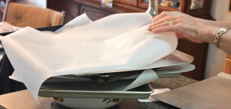Parchment paper on five cookie sheets: each will hold a dozen buns, oven on to 350°F, and mom’s favourite glass out to cut the buns with. She used to have four, but now there is one. Oh, my! What will happen should this perfect sized glass break? I shouldn’t make fun of her. I am far too similar! Look at the mound of luscious soft promises.