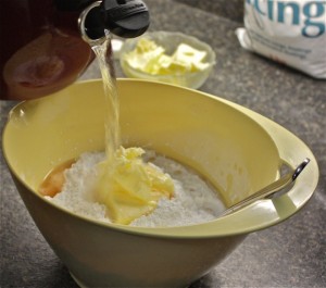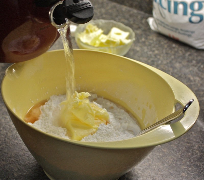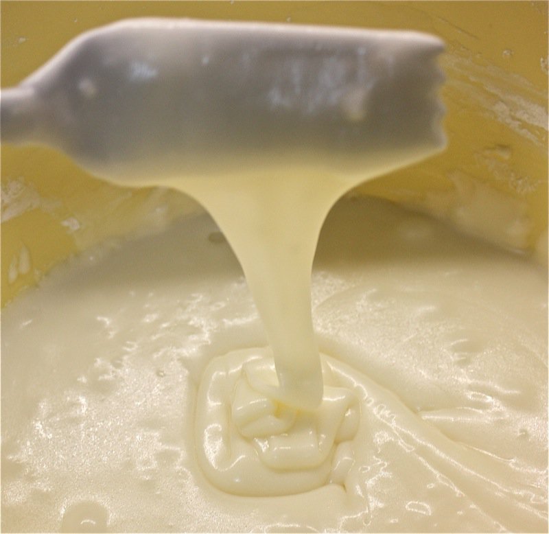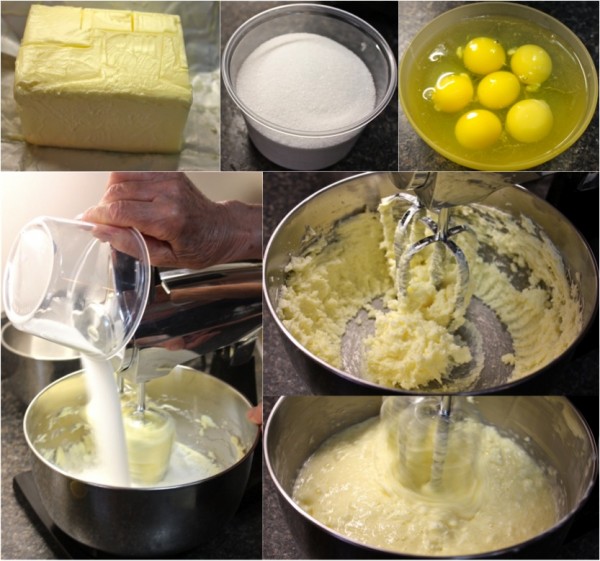 Her Sunbeam Mixmaster is over 30 years old. It still looks like new and works like a charm. She will be rendered helpless without it. This is her second one. The first one survived for over 30 years, too, but was dropped. They no longer make them like this, so she has been searching for a replacement “just in case”, but nothing comes close, in her opinion. She keeps the speed on low throughout most of this process. Adding each item as listed in the recipe and as pictured above and below, then beating in slowly and thoroughly.