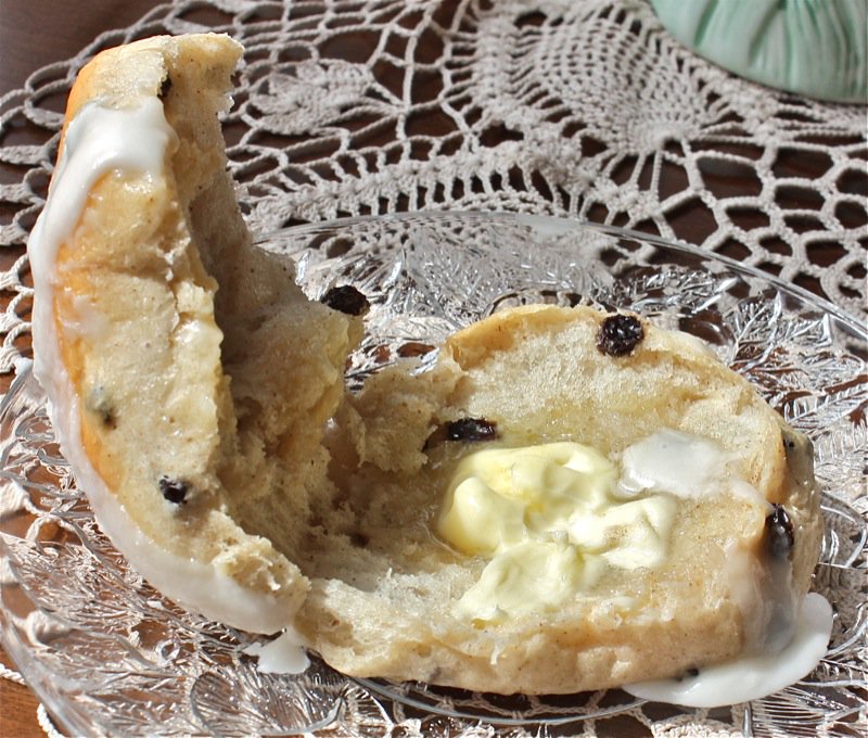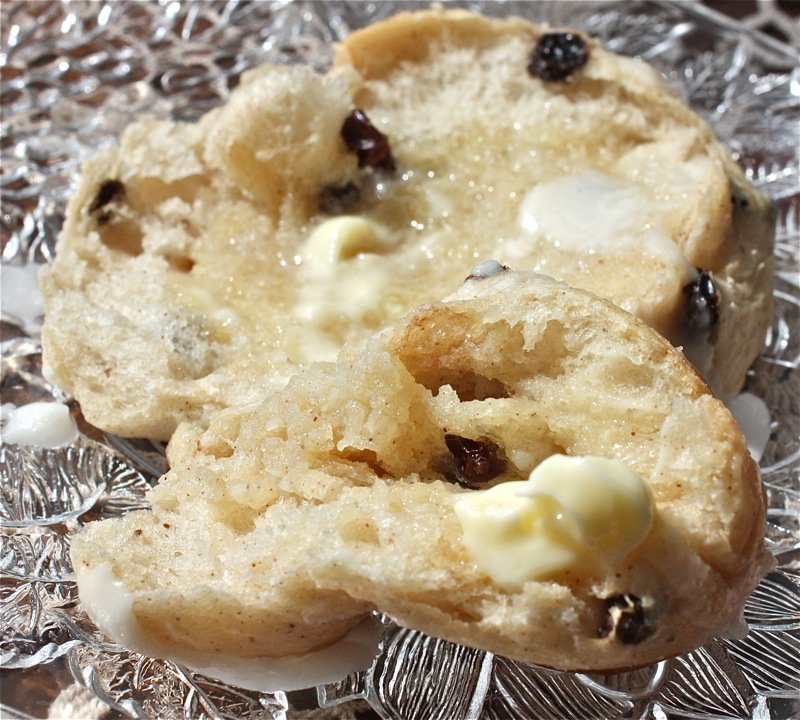 Homemade Hot Cross Buns! What is with a hot crossed bun crossed before it is hot? When I was a child, there were no hot cross buns in grocery stores or bakeries. The only hot cross buns I knew were being turned out in fragrant humid kitchens all across the prairies on every Good Friday just before Easter. We would wait for them to be cool enough to touch and then slather them with fresh creamy butter. The top half was always the best. The glaze just brought the rich buttery egg-filled dough to another level. So did the melted butter. If you have never had a homemade hot cross bun, put it on your Bucket List. Now.