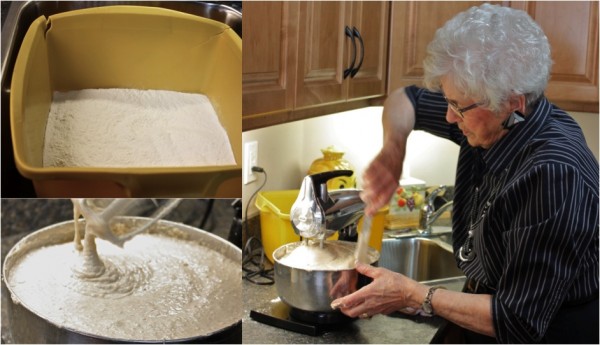Mom just stirs them in with a huge spoon until all of the flour has been incorporated into the dough. Then, one cup of flour covers the mat and the dough is plopped out onto it for kneading.