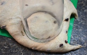 It is flattened with her hands to a rectangle for cutting. The lip of the glass has been floured and needs to be floured every three cuts.