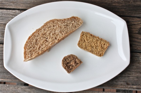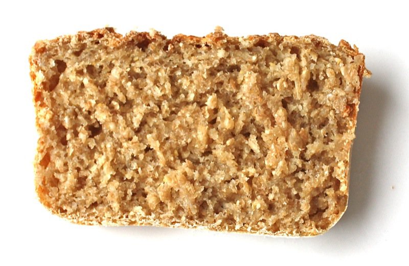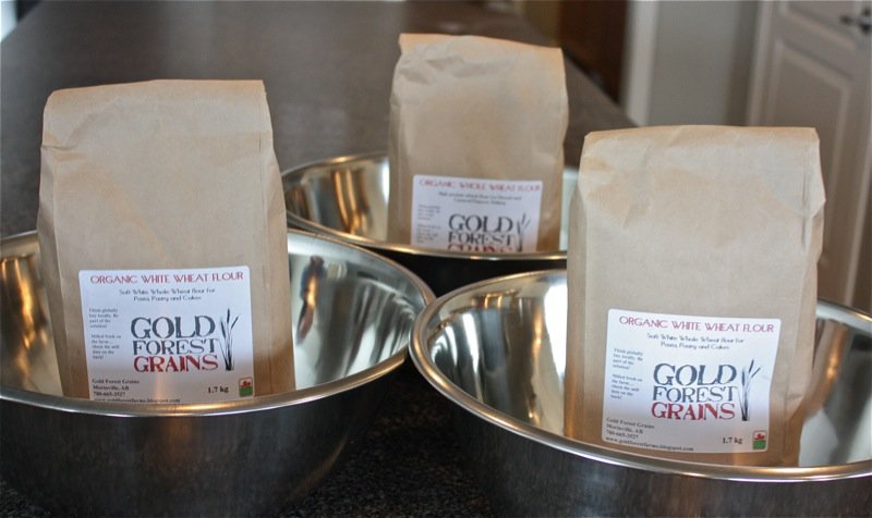 Here are the three flours made into bread using 100% of each flour. The one below is made with the pastry pasta flour. It was fragrant, moist and very tasty. You can see the one below, made with the 100% whole wheat flour was made in a smaller loaf pan as it was a heavier and much more dense dough. The bread was also heavier, more most and a little more dense. It was deeply fragrant and flavourful. Both were exceptional with the major difference being the resulting weight of the dough: the whole wheat didn’t rise as high and was a heavier dough. It was also more moist. However, both were clearly made with freshly ground flour, the darker having a fuller body flavourwise.