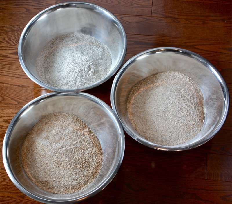 The lightest is Dan’s pasta and pastry flour. I enjoyed it as a whole wheat loaf flour. It was far too course for any pastry or pasta, in my opinion. The darkest flour is the rye. No one ever makes 100% rye bread. Actually, 100% whole wheat bread is exceptionally rare when made artisanally, as well. But, I did both, this day, just for the fun of it. I wanted to taste and test.