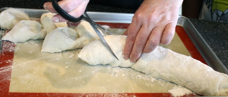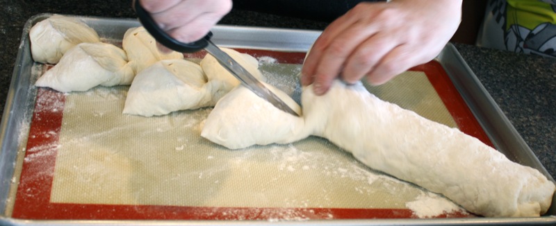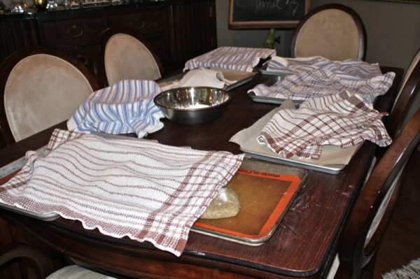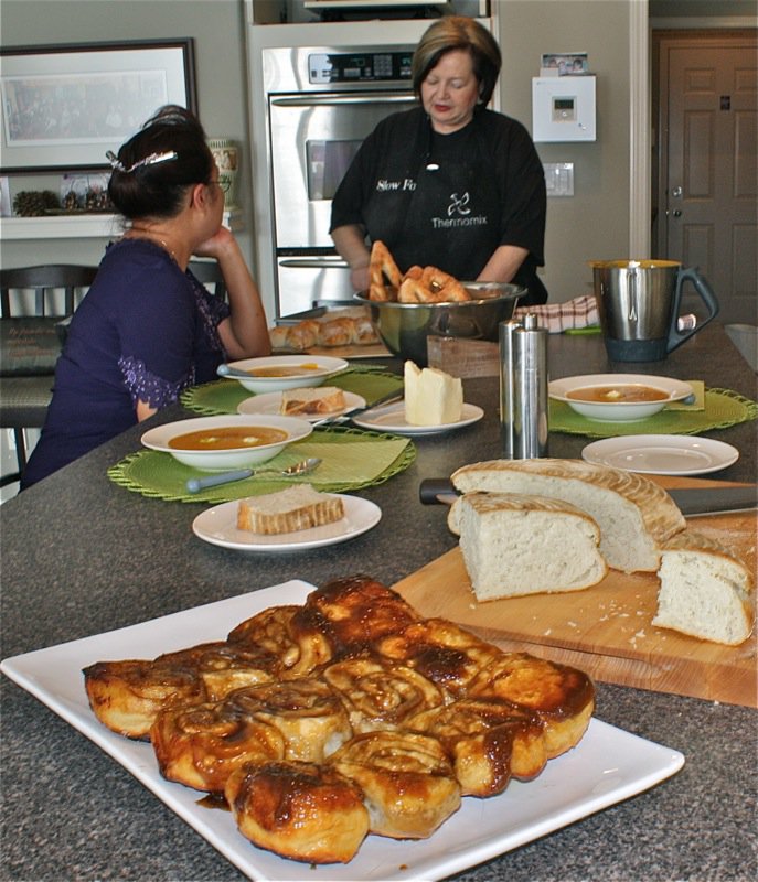 Preparing the dough and making this much bread was not very much work, really. The problem was only having two ovens with all this bread to bake. We were a little over our head, time wise, but the gals arrived at 10 and we were finished everything by 4:30 with our lunch break. That even includes clean up!