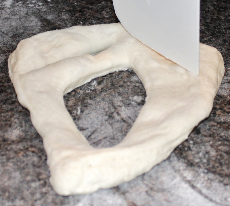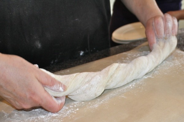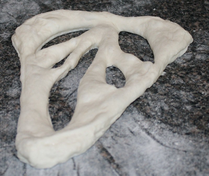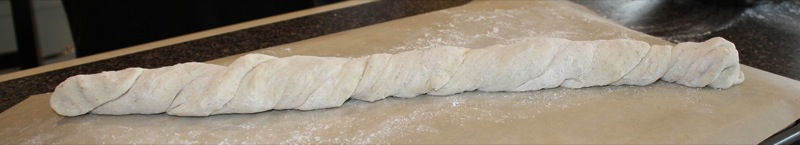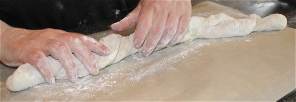 - Gently release dough from the bowl and stretch into a rectangle (about 25 cm long); roll in rice flour and twist randomly to form the shape (we sprinkled the olives on at the rectangle stage, folded the dough over them in thirds, and then twisted to form the shape)