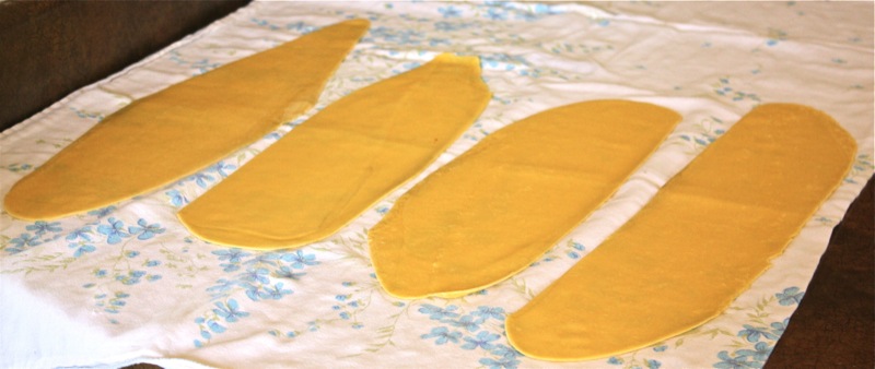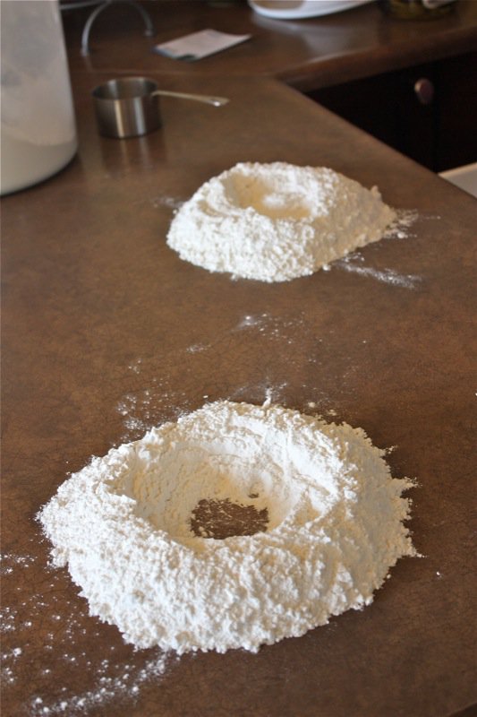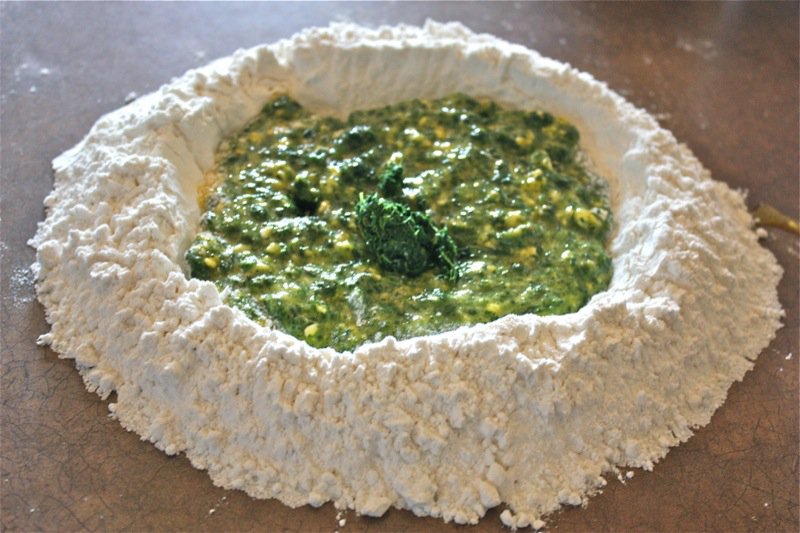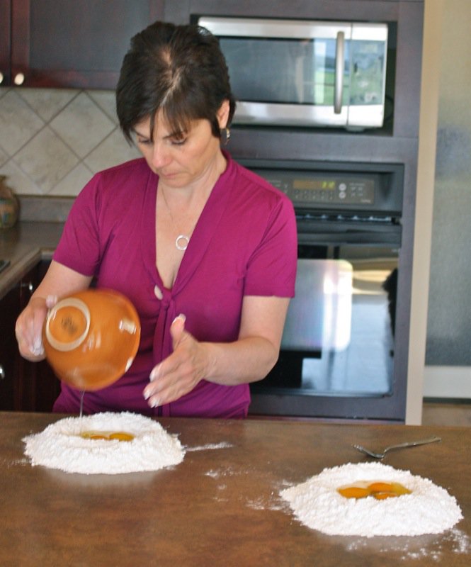 The eggs are beaten and then the flour is just slowly incorporated into them, bit by bit, maintaining the edges so they don’t pool out. She uses two cups of plain old white flour, three eggs and a pinch of salt with a dash of olive oil. The recipe follows.