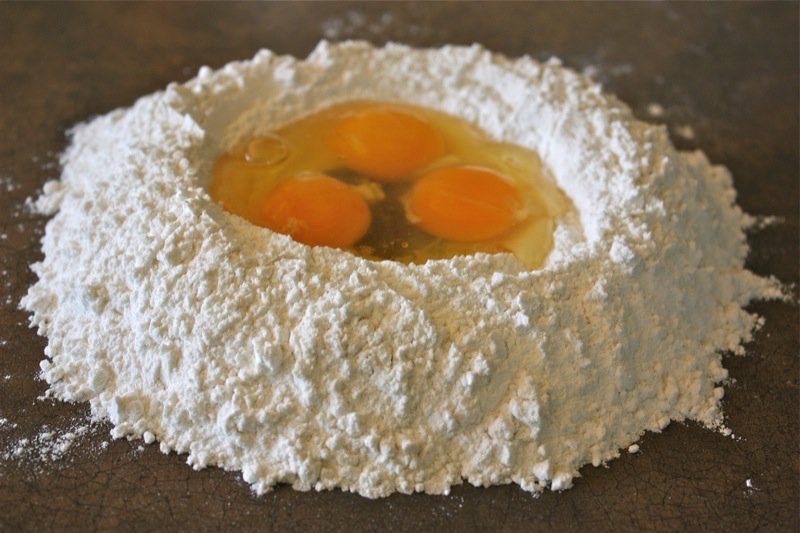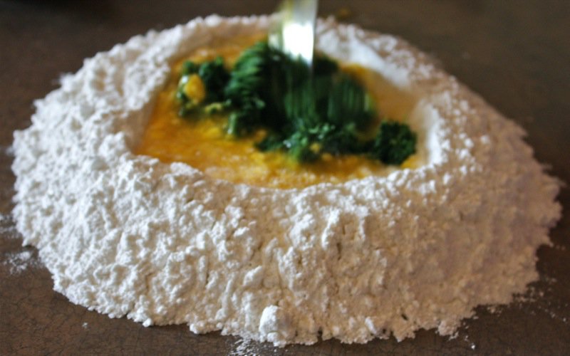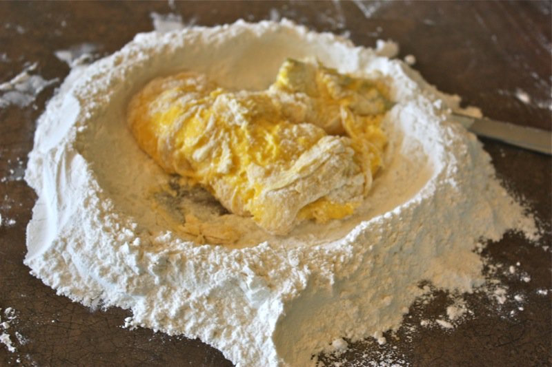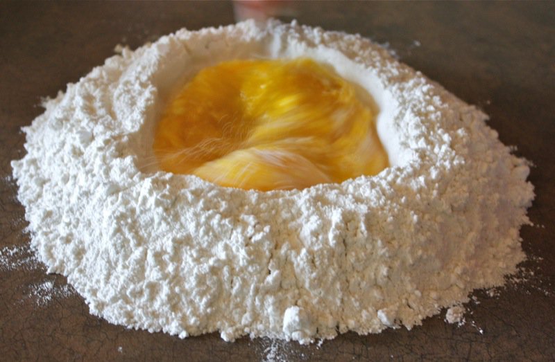 - Beat the eggs to combine and then work in the flour from the sides until you need to start kneading the dough