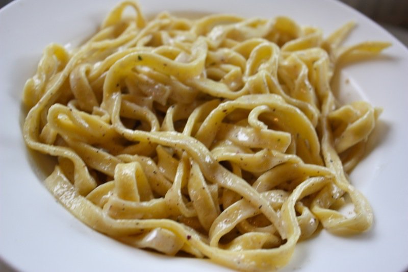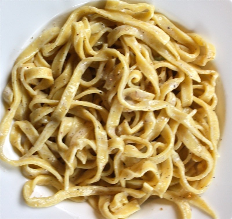 Yes, Nadia tucked a generous amount of pasta into some containers for me to take home and prepare for dinner that evening. I followed her advice and added only cream to the strained pasta and heated it until it thickened a bit with some salt and pepper and a bit of freshly ground nutmeg. And so many think that eating healthy fresh local food is expensive. Pennies. And bliss.