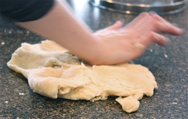 - Once it forms a soft ball, engage in the “fraiser” or “frâser” method demonstrated in the photos, above: 3 or 4 times, until the dough is homogenous (with attention not to overwork it)