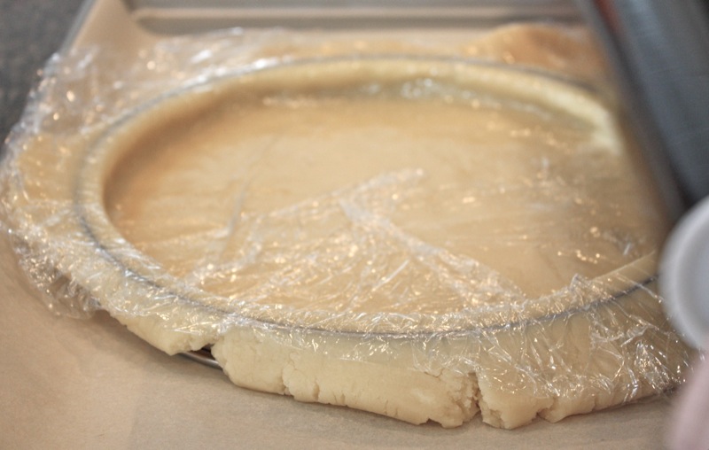 - Poke holes in the dough, line the crust with plastic wrap and fill it with beans or rice to keep the bottom from puffing and the sides from falling