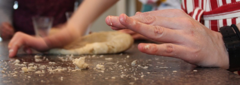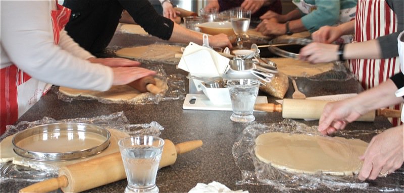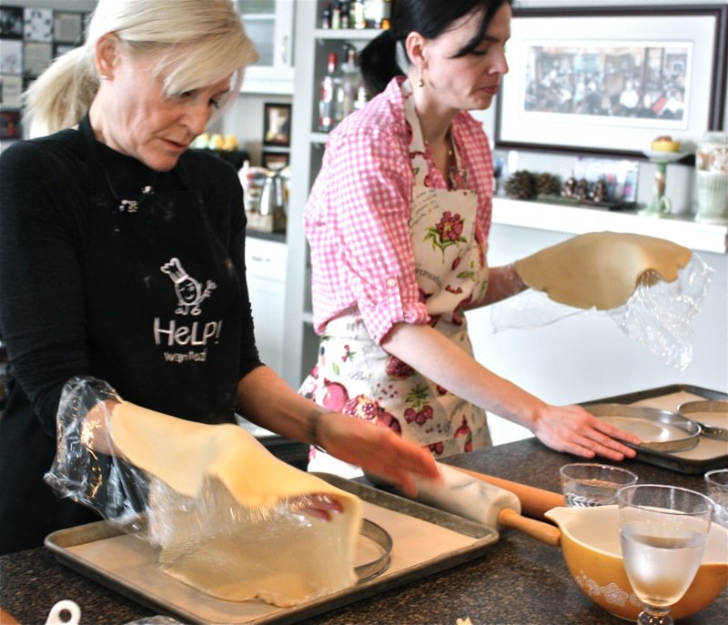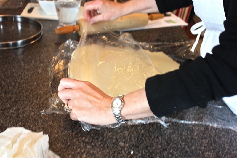 Below, the pastry for the quiche is being trimmed by the rolling pins rolling over the tart pan.