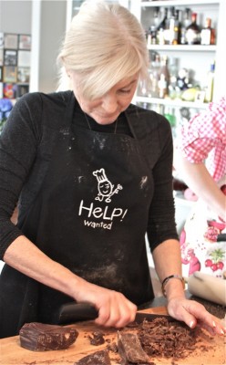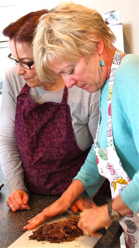 While the Pâte Sablée was baking in the oven (and it needs to fully bake, as the filling is just poured in and left to set), the gals shredded the chocolate.