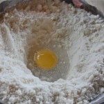 - Create a well and pour the egg yolk and the water and combine all ingredients using your finger