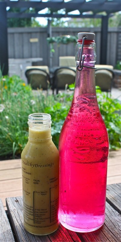 The flowers have risen to the top! I strained the vinegar and stored it. You can find a yummy salad dressing recipe I made from it here. See the gorgeous colour of the strained vinegar beside the dressing below. Chive Flower Vinegar: your new Spring preserve!
